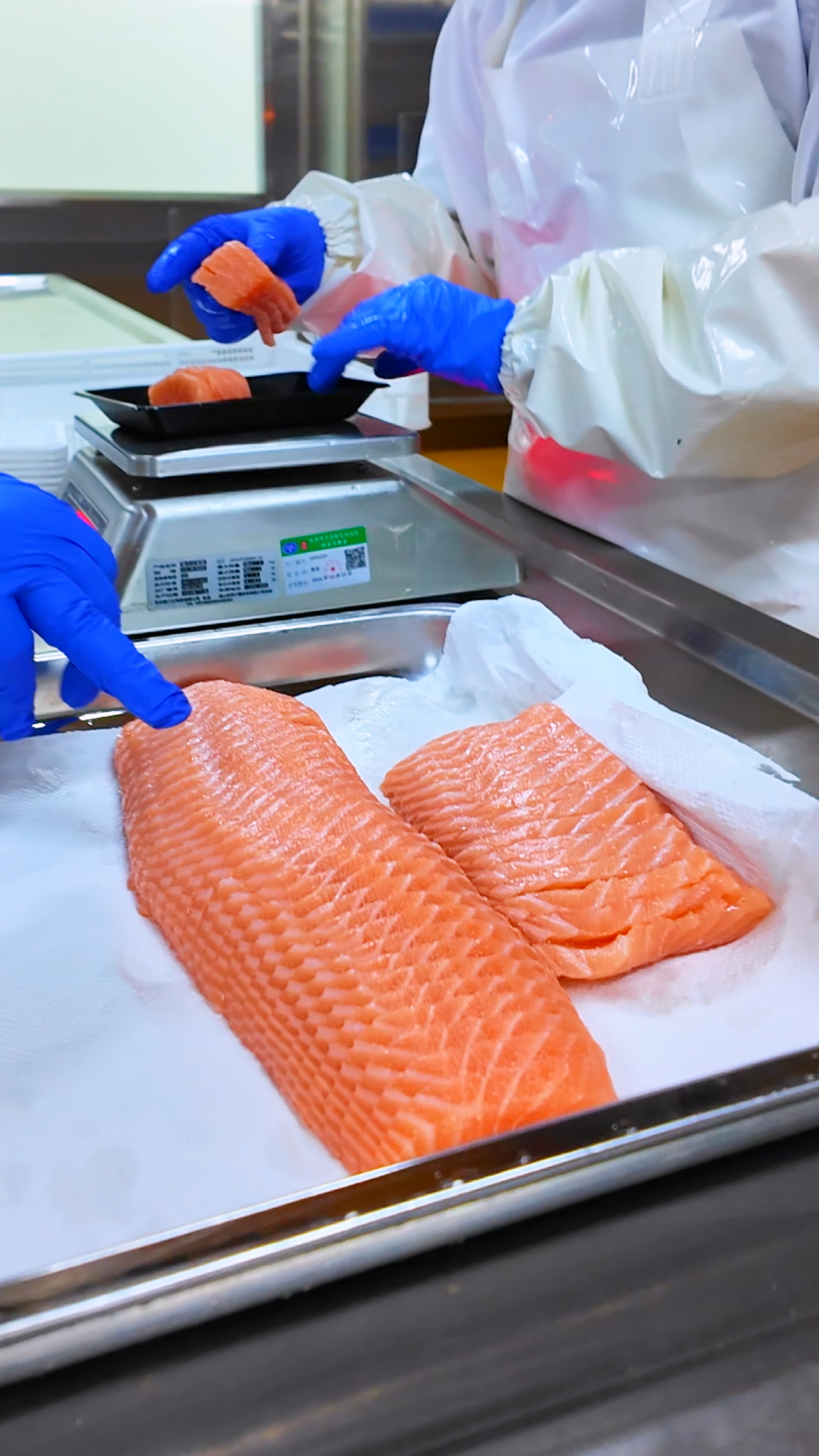 记者走进需严格消毒、身着全套隔离服才能进入的加工车间,清冷的气息瞬间包裹全身。车间洁净明亮,各区域分工明确,每周约有70吨三文鱼在这里完成“蜕变”。马小刚边引导边介绍:“原料进厂,我们首先‘验明正身’,核对所有通关和检疫信息,确认无误后立刻进入加工程序。”